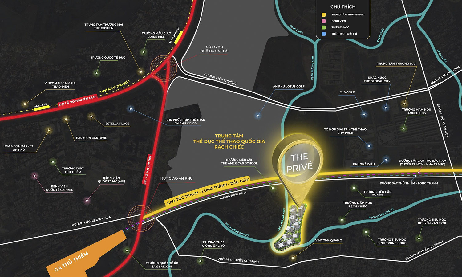 The Privé tọa lạc tại mặt tiền đường Song Hành cao tốc TP.HCM – Long Thành – Dầu Giây, thuộc khu dân cư Nam Rạch Chiếc, phường An Phú, TP. Thủ Đức (trước đây là Quận 2). Đây là tọa độ cực kỳ đắc giá khi nằm gần các tuyến giao thông huyết mạch như nút giao An Phú, đường Mai Chí Thọ, đường Vành đai 2 và Vành Đai 3, giúp cư dân dễ dàng kết nối đến trung tâm Quận 1, khu đô thị Thủ Thiêm, sân bay Long Thành.
