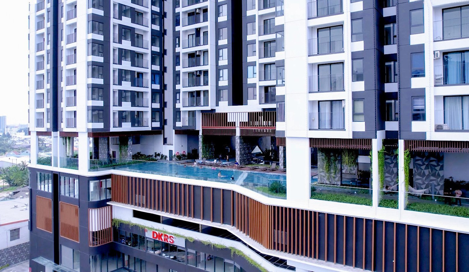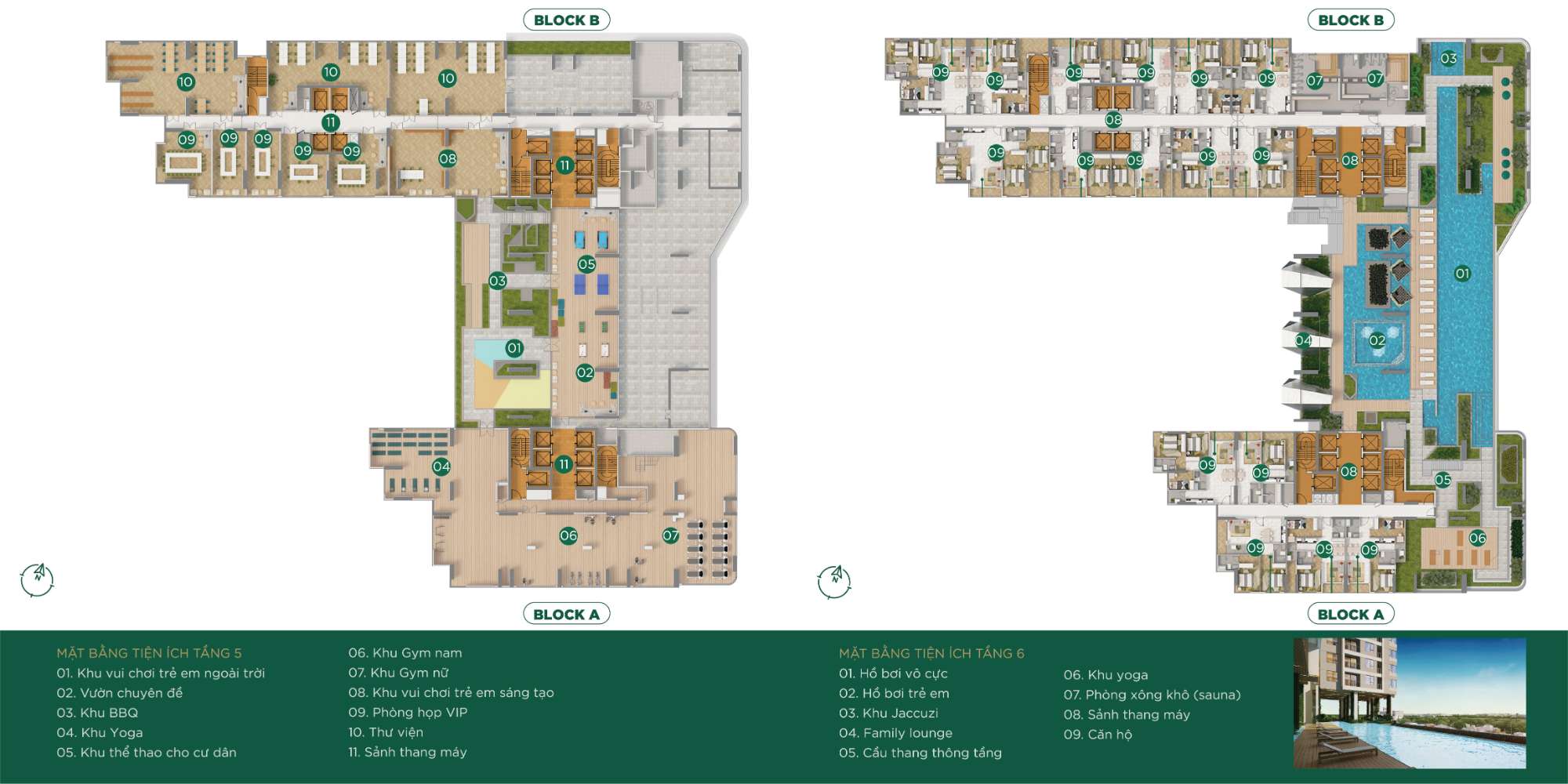 - Tầng 3–4 dành cho bãi đỗ xe máy; tầng 5–6 tích hợp hệ tiện ích như hồ bơi, gym, spa, xông hơi…